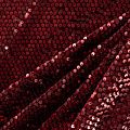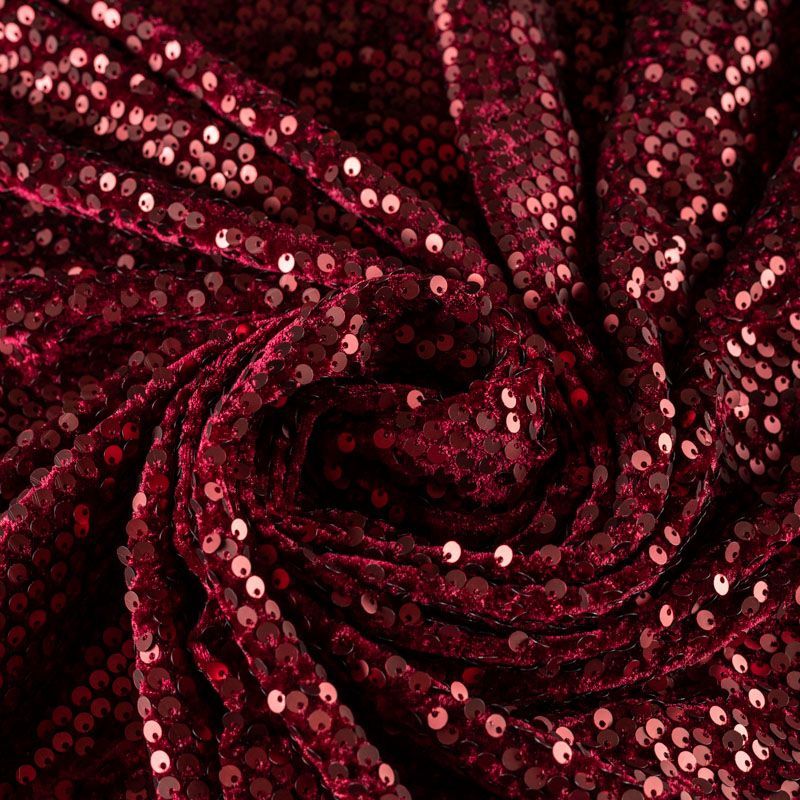 Бархатное полотно на трикотажной основе сочного оттенка гранатового сока. По всей поверхности ткань усеяна матовыми пайетками, которые очень деликатно отражают свет. Бархат достаточно тонкий и пластичный, прекрасно драпируется и укладывается в складки. Пайетки на бархате эффектно смотрятся в виде широких оборок и воланов, юбок прямого силуэта, свободных платьев-балахонов, курток, бомберов и топов с напусками.