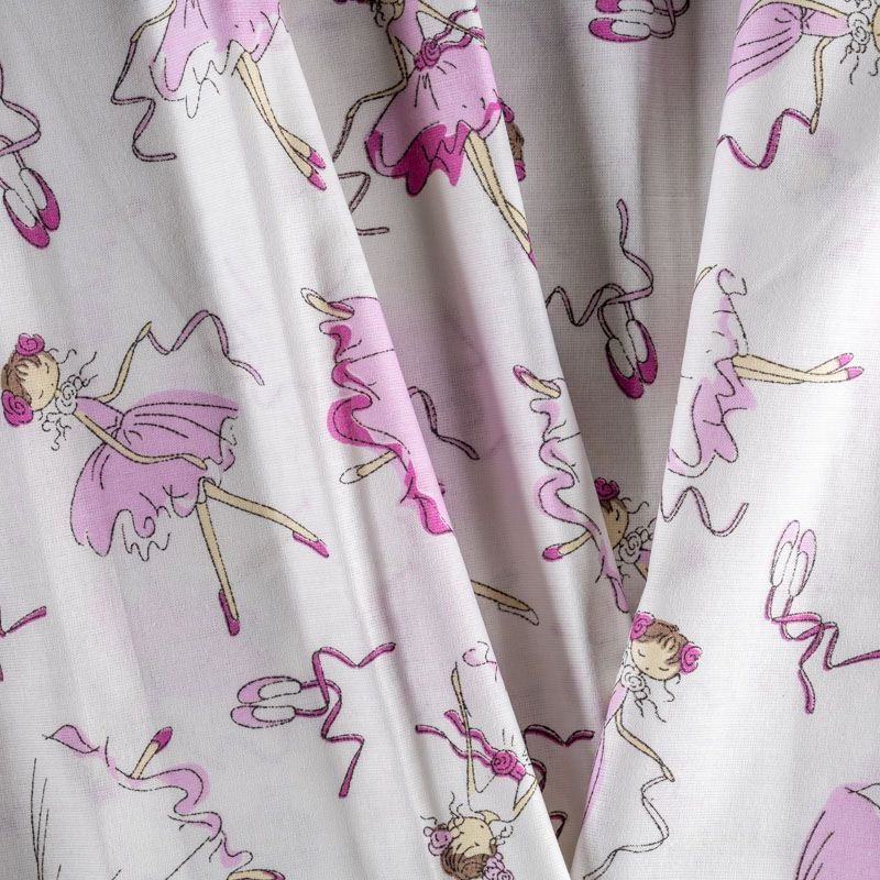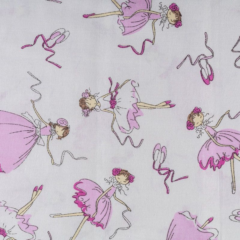 Плотная натуральная ткань с особым принципом переплетения нитей: крест-накрест. Имеет гладкую матовую поверхность, немного шероховатая на ощупь, не тянется, немного просвечивает. Прочная и стойкая к износу, надолго сохраняет яркость красок, практически не мнется. Милый детский принт в виде танцующих балерин на белом фоне прекрасно подойдет для пошива постельного белья, изготовления пеленок, бортиков для кроватки, домашней одежды и других предметов интерьера.