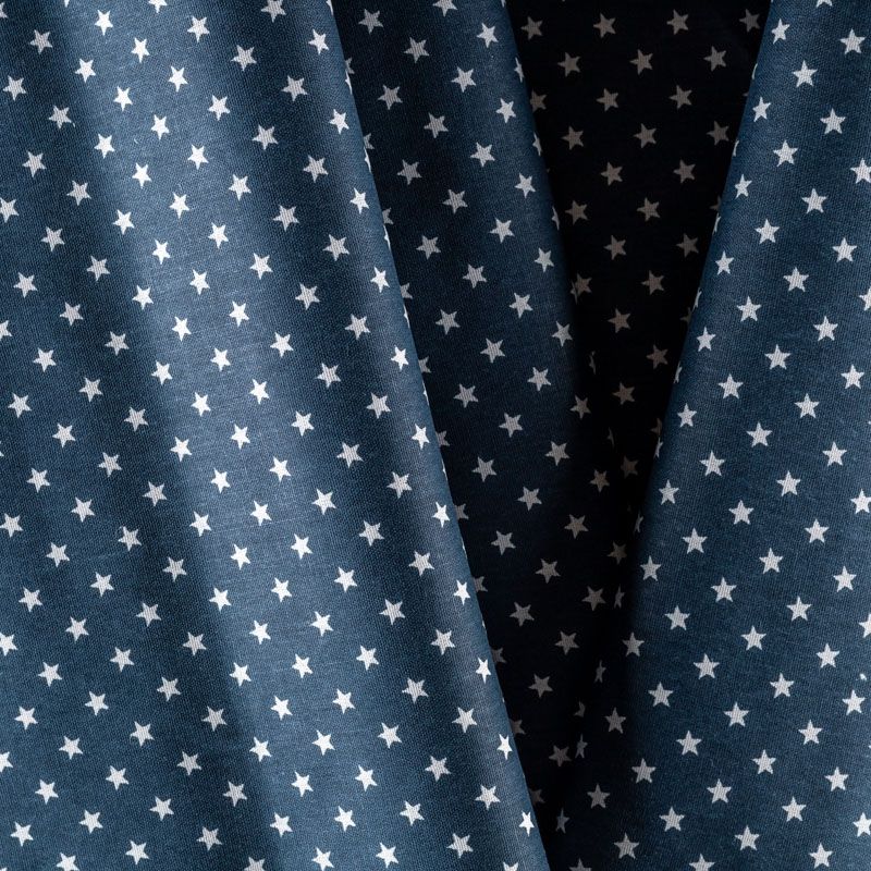 Плотная натуральная ткань с особым принципом переплетения нитей: крест-накрест. Имеет гладкую матовую поверхность чуть шероховатую на ощупь, не тянется, немного просвечивает. Прочная и стойкая к износу, надолго сохраняет яркость красок, не растягивается при стирке, практически не мнется. Принт в виде мелких белых звездочек на темно-синем фоне прекрасно подойдет для пошива постельного белья, изготовления пеленок, бортиков для кроватки, домашней одежды и других предметов интерьера.