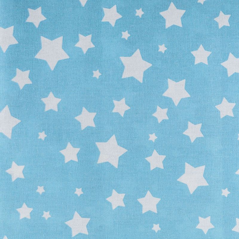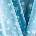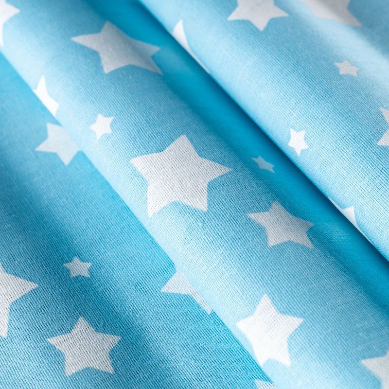 Плотная натуральная ткань с особым принципом переплетения нитей: крест-накрест. Имеет гладкую матовую поверхность чуть шероховатую на ощупь, не тянется, немного просвечивает. Прочная и стойкая к износу, надолго сохраняет яркость красок, не растягивается при стирке, практически не мнется. Принт в виде  белых звездочек разного размера на небесно-голубом фоне прекрасно подойдет для пошива постельного белья, изготовления пеленок, бортиков для кроватки, домашней одежды и других предметов интерьера.