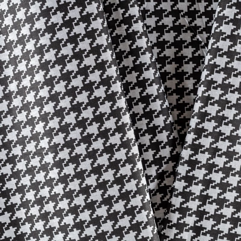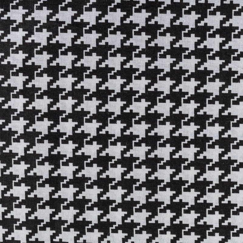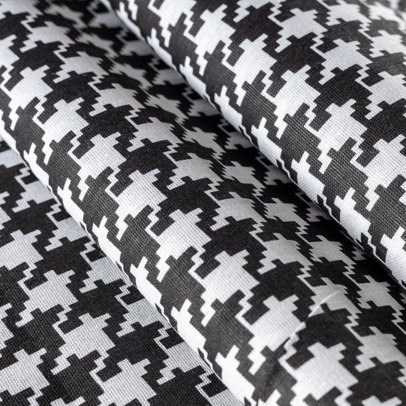 Плотная натуральная ткань с особым принципом переплетения нитей: крест-накрест. Имеет гладкую матовую поверхность чуть шероховатую на ощупь, не тянется, немного просвечивает. Прочная и стойкая к износу, надолго сохраняет яркость красок, не растягивается при стирке, практически не мнется. Рисунок, имитирующий "гусиную лапку" черного цвета на белом фоне, прекрасно подойдет для пошива постельного белья, изготовления пеленок, бортиков для кроватки, домашней одежды и других предметов интерьера.