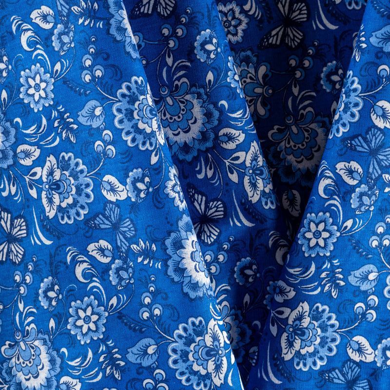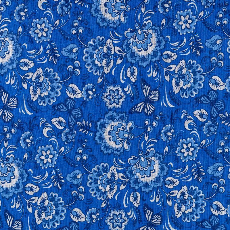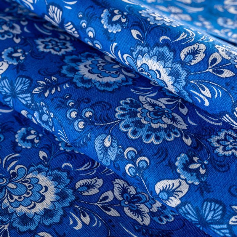 Плотная натуральная ткань с особым принципом переплетения нитей: крест-накрест. Имеет гладкую матовую поверхность, немного шероховатая на ощупь, не тянется, немного просвечивает. Прочная и стойкая к износу, надолго сохраняет яркость красок, практически не мнется. Яркий узнаваемый принт в стиле Гжель на насыщенном васильковом фоне прекрасно подойдет для пошива постельного белья, изготовления пеленок, бортиков для кроватки, домашней одежды и других предметов интерьера.