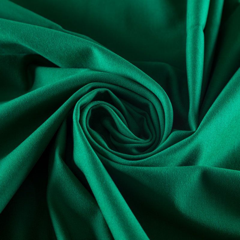 Эластичный, плотный хлопковый трикотаж изумрудного оттенка с теплым подтоном. Поверхность ткани гладкая и матовая, с изнанки - с шелковистым мягким ворсом.  Материал упругий, имеет растяжимость по всем сторонам, не просвечивается, хорошо держит форму, уютный, приятный к телу и удобный в носке. Применяется в пошиве костюмов, жакетов, кардиганов, платьев и юбок.