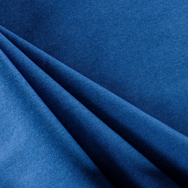 Джинсовое полотно классического синего оттенка. Поверхность ткани матовая, фактурная в диагональный рубчик. Материал имеет высокую плотность, при небольшой толщине, мягкий и приятный на ощупь, немного тянется за счет эластана в составе, обладает устойчивостью к истиранию и механическим повреждениям. Подойдет для пошива рубашек, сарафанов, платьев, юбок, шорт, брюк-джоггеров, лёгких курток и жакетов.