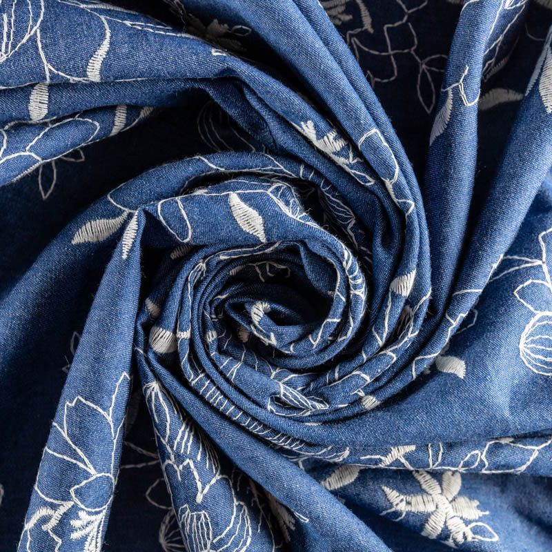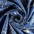 На сине-голубом фоне цветы, вышитые белой нитью со сдержанным атласным блеском. Полотно легкое, средней плотности, очень пластичное, не держит форму. Материал отлично драпируется, формируя мягкие складки. Подойдет для прямых, расклешенных платьев, сарафанов, платья-рубашки, юбки или туники.