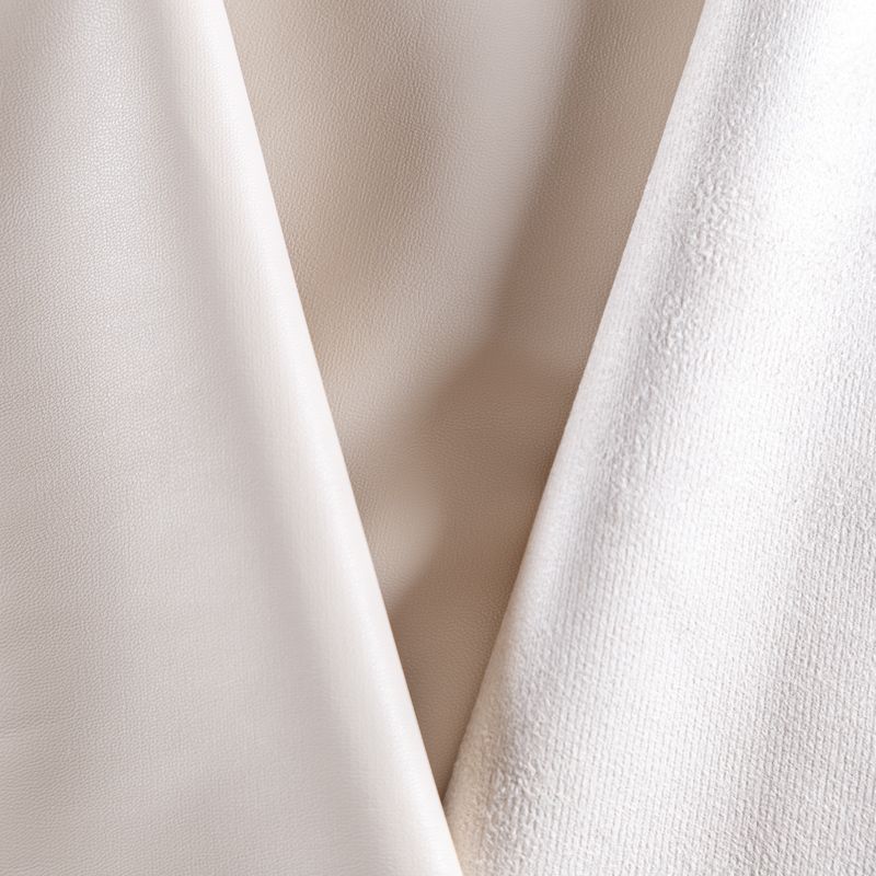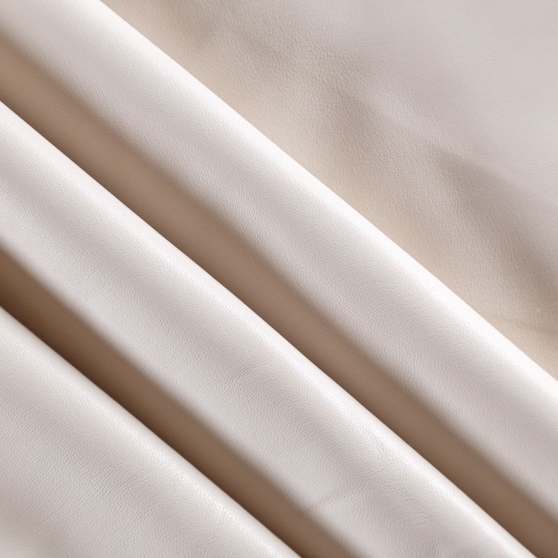 Искусственный материал, имитирующий натуральную кожу молочного оттенка. Поверхность ткани матовая, гладкая, изнаночная сторона с имитацией светлой замши. Приятная на ощупь, тянется, не просвечивает, пластичная. Подойдет для пошива куртки, костюма, платья, юбки, брюк, шорт, комбинезона, сумки, рюкзака.