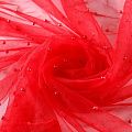 Тонкая прозрачная сетка средней жесткости красного оттенка декорирована не крупными бусинами в тон полотна. Используется для пошива одежды для различных праздников, концертов, пышных юбок, платьев, а также для отделки и украшения, создания предметов декора и украшения помещений для торжественных мероприятий.