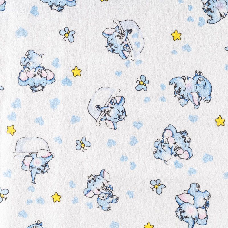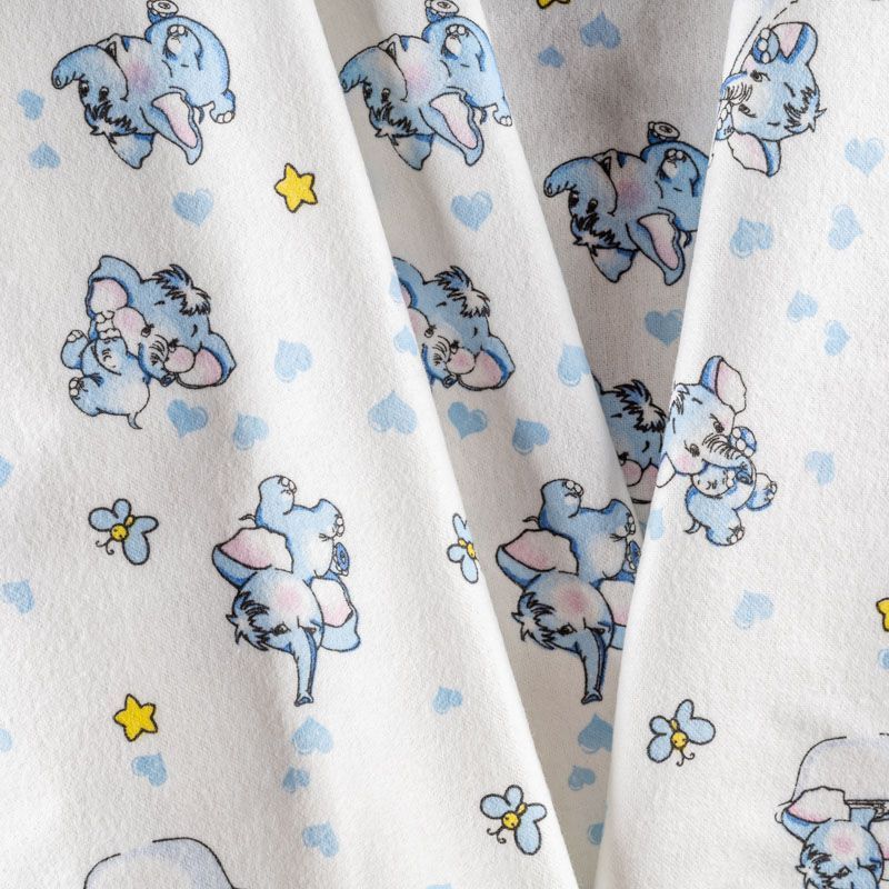 Износостойкий мягкий материал, не раздражает кожу, не садится, отлично впитывает влагу и хорошо удерживает тепло. На лицевой стороне мягкий ворс. Милый детский принт в виде рисованных слоников на белом фоне прекрасно подойдет для пошива постельного белья, изготовления пеленок, бортиков для кроватки, домашней одежды, пижамы и других предметов интерьера.