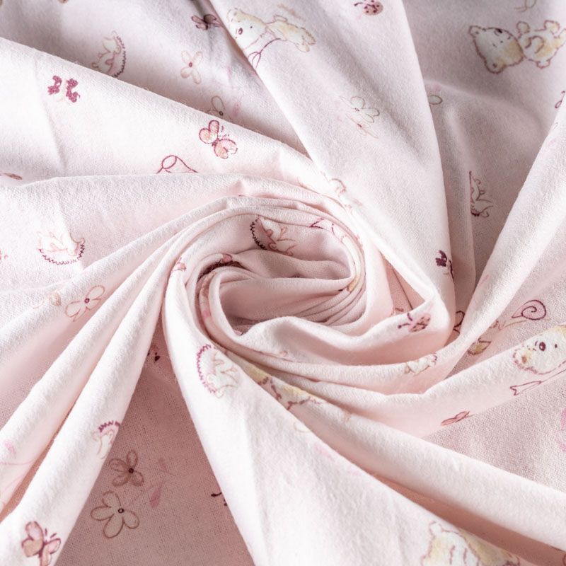 Износостойкий мягкий материал, не раздражает кожу, не садится, отлично впитывает влагу и хорошо удерживает тепло. На лицевой стороне мягкий ворс. Милый детский принт в виде рисованных мишек на нежном розовом фоне прекрасно подойдет для пошива постельного белья, изготовления пеленок, бортиков для кроватки, домашней одежды, пижамы и других предметов интерьера.