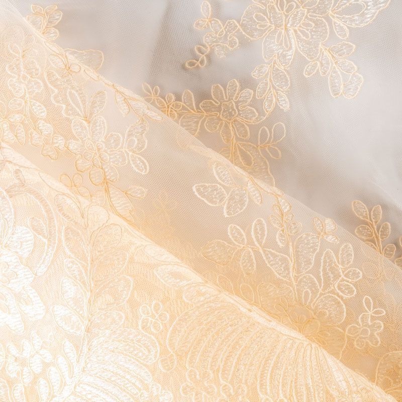 Вышивка на сетке в оттенке спелой мякоти банана с крупным флористическим узором. Полотно мягкое, легкое и пластичное, хорошо тянется. Сетка не жесткая, приятная к телу. Узор вышит мягкой пряжей, образуя красивую фактуру, имитирующую ручную вышивку, и оформлен кордовой нитью. С обеих сторон ткань украшена симметричными фестонами, что придает полотну законченный и нарядный вид. Великолепно будет смотреться в нарядном вечернем, свадебном платье, платье на выпускной бал, в юбках, блузках, топах. Набирается для изделя объемом.