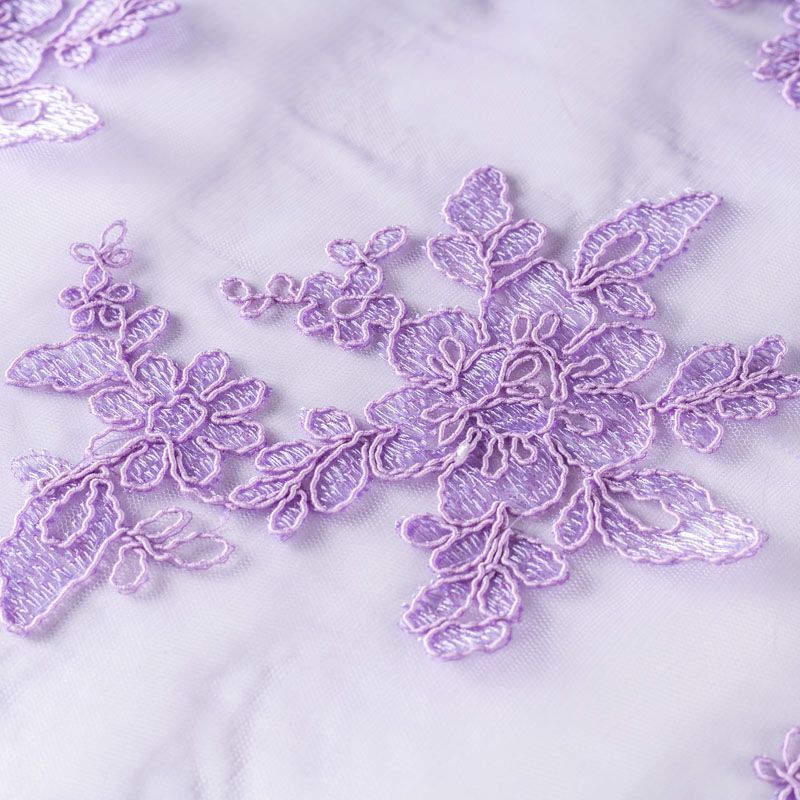 Вышивка на сетке красивого фиалкового оттенка с крупным флористическим узором. Полотно мягкое, легкое и пластичное, хорошо тянется. Сетка не жесткая, приятная к телу. Узор вышит мягкой пряжей, образуя красивую фактуру, имитирующую ручную вышивку, и оформлен кордовой нитью. С обеих сторон ткань украшена симметричными фестонами, что придает полотну законченный и нарядный вид. Великолепно будет смотреться в нарядном вечернем, свадебном платье, платье на выпускной бал, в юбках, блузках, топах. Набирается для изделя объемом.