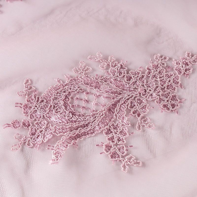 Вышивка на сетке приглушенного розового оттенка с крупным фантазийным узором в виде пера жар-птицы. Полотно мягкое, легкое и пластичное, хорошо тянется. Сетка не жесткая, приятная к телу. Узор вышит мягкой пряжей, образуя красивую фактуру, имитирующую ручную вышивку, и оформлен кордовой нитью. С обеих сторон ткань украшена симметричными фестонами, что придает полотну законченный и нарядный вид. Великолепно будет смотреться в нарядном вечернем платье, платье на выпускной бал, в блузках, топах. Набирается для изделя объемом.