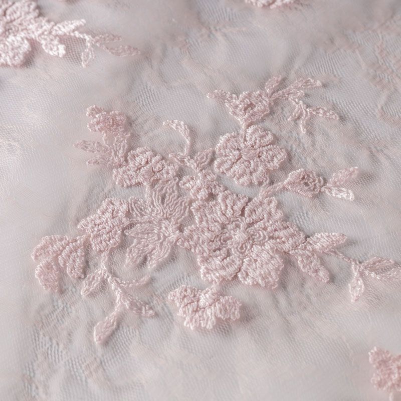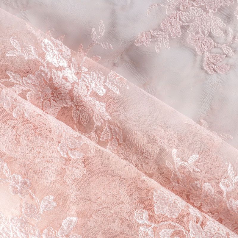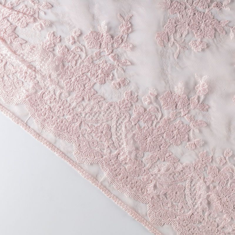 Итальянский гипюр с воздушным кружевным орнаментом, который соединяет прозрачная тонкая сетка пудрово-розового оттенка. Вышивка выполнена вискозной нитью не очень плотно, поэтому полотно тонкое, легкое, очень мягкое и пластичное, хорошо драпируется, приятное тактильно. С обеих сторон ткань украшена симметричными фестонами, что придает ей законченный и нарядный вид. Великолепно будет смотреться в нарядном вечернем, свадебном платье, платье на выпускной бал, в юбках, блузках, топах.