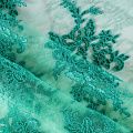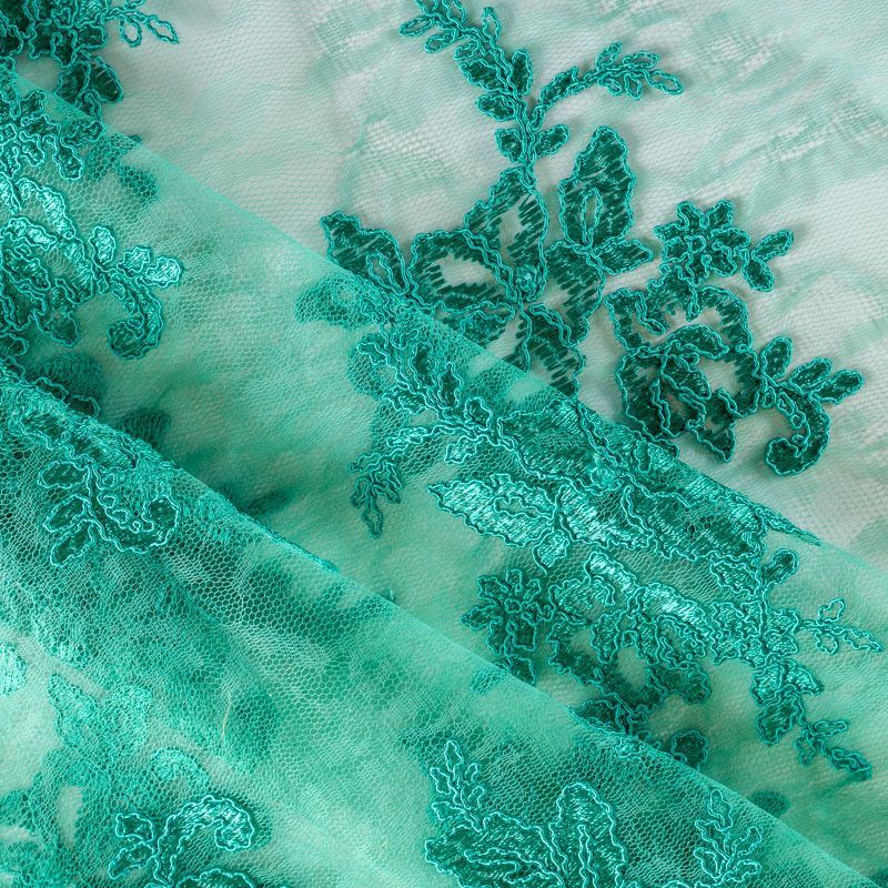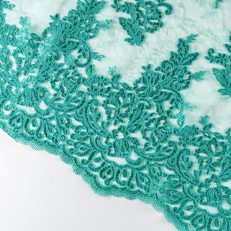 Кружевное полотно на сетчатой жаккардовой основе насыщенного оттенка бриллиантовой зелени с флористическим узором. Тонкое, легкое, очень мягкое и пластичное, хорошо драпируется, приятное тактильно. Вышивка оформлена кордовой нитью. С обеих сторон ткань украшена симметричными фестонами, что придает полотну законченный и нарядный вид. Великолепно будет смотреться в нарядном вечернем, свадебном платье, платье на выпускной бал, в юбках, блузках, топах. Также можно применять отдельные элементы для декора, которые вырезаются из полотна.