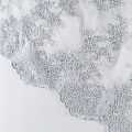 Кружевное полотно на сетчатой жаккардовой основе жемчужного оттенка с флористическим узором. Тонкое, легкое, очень мягкое и пластичное, хорошо драпируется, приятное тактильно. Вышивка оформлена кордовой нитью. С обеих сторон ткань украшена симметричными фестонами, что придает полотну законченный и нарядный вид. Великолепно будет смотреться в нарядном вечернем, свадебном платье, платье на выпускной бал, в юбках, блузках, топах. Также можно применять отдельные элементы для декора, которые вырезаются из полотна.