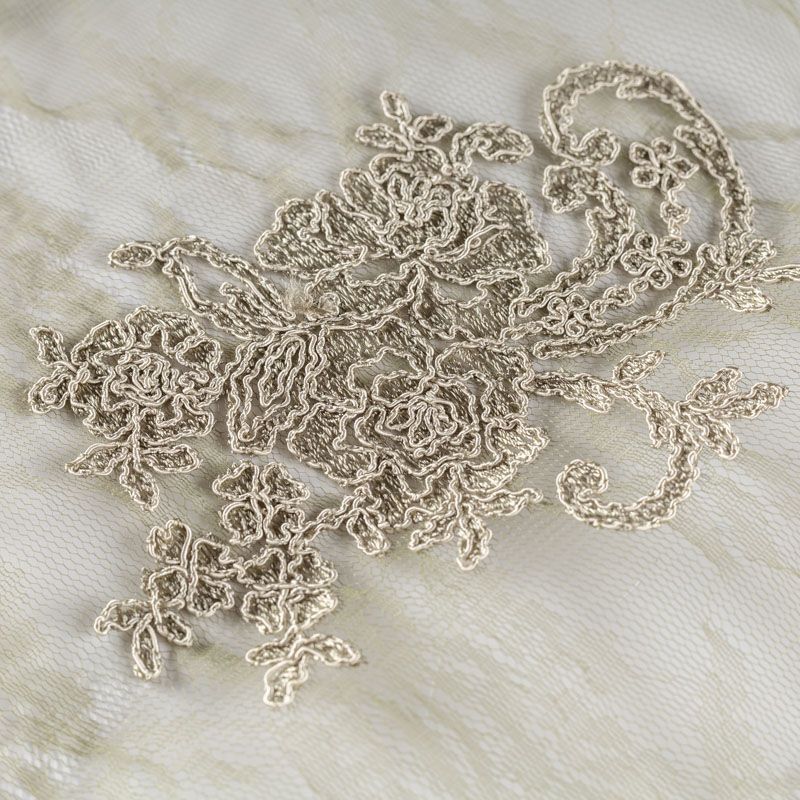 Кружевное полотно на сетчатой жаккардовой основе цвета фисташки с флористическим узором. Тонкое, легкое, очень мягкое и пластичное, хорошо драпируется, приятное тактильно. Вышивка оформлена кордовой нитью. С обеих сторон ткань украшена симметричными фестонами, что придает полотну законченный и нарядный вид. Великолепно будет смотреться в нарядном вечернем, свадебном платье, платье на выпускной бал, в юбках, блузках, топах. Также можно применять отдельные элементы для декора, которые вырезаются из полотна.