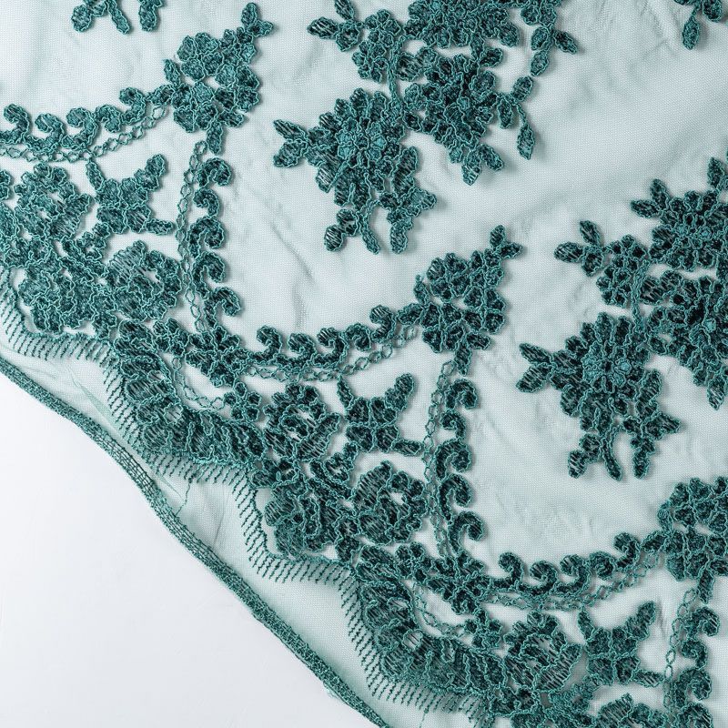 Вышивка на сетке темно-зеленого оттенка с флористическим узором. Полотно мягкое, легкое и пластичное, хорошо тянется. Сетка не жесткая, приятная к телу. Узор вышит мягкой пряжей, образуя красивую фактуру, имитирующую ручную вышивку, и оформлен кордовой нитью. С обеих сторон ткань украшена симметричными фестонами, что придает полотну законченный и нарядный вид. Великолепно будет смотреться в нарядном вечернем платье, платье на выпускной бал, в блузках, топах. Набирается для изделя объемом.