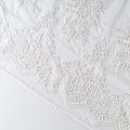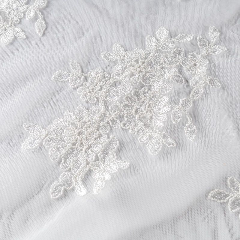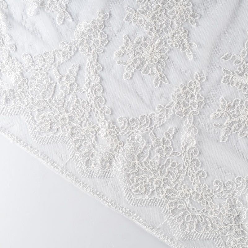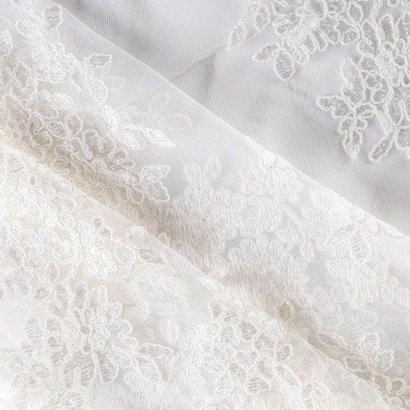 Кружевное полотно на сетчатой жаккардовой основе молочно-сливочного оттенка с флористическим узором. Тонкое, легкое, очень мягкое и пластичное, хорошо драпируется, приятное тактильно. Вышивка оформлена кордовой нитью. С обеих сторон ткань украшена симметричными фестонами, что придает полотну законченный и нарядный вид. Великолепно будет смотреться в нарядном вечернем платье, платье на выпускной бал, в блузках, топах. Также можно применять отдельные элементы для декора, которые вырезаются из полотна.