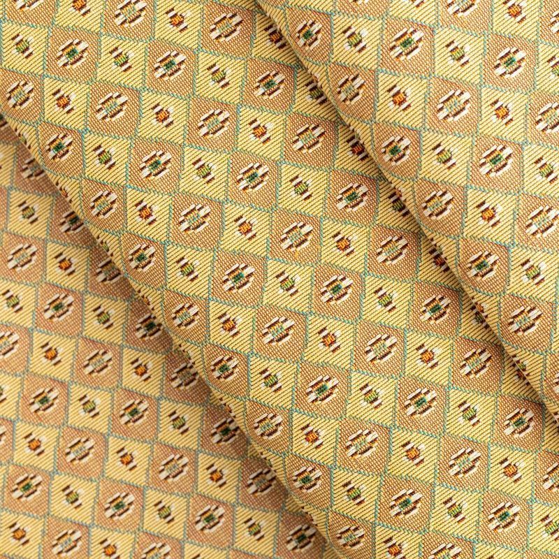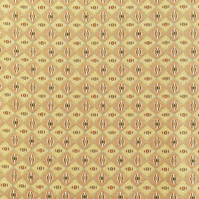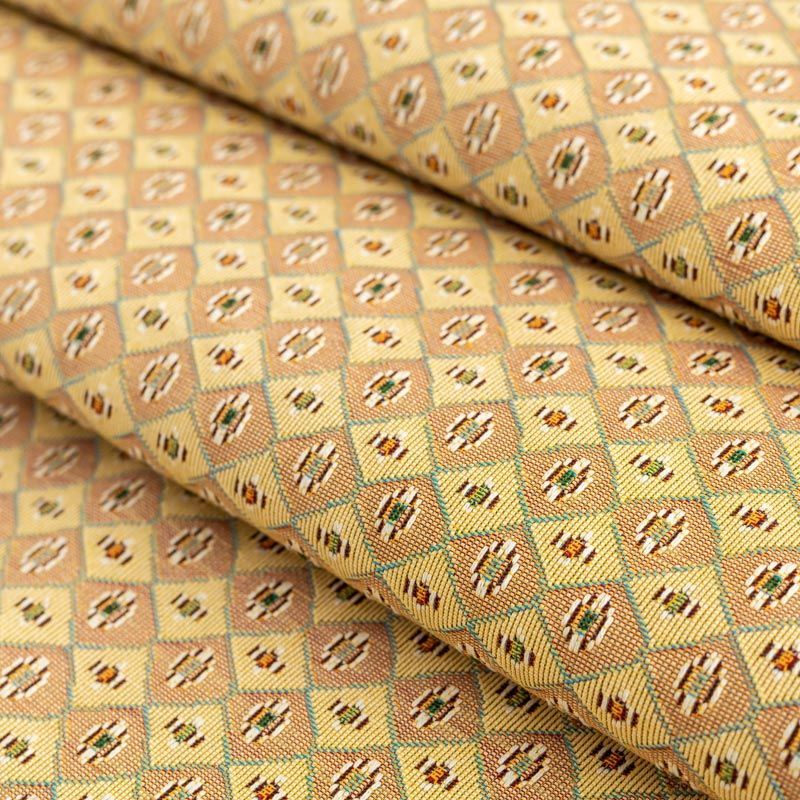 Гобелен представляет собой ткань, выполненную  перекрестным плетением нитей с одномоментным созданием сюжетной или орнаментальной композиции. Это плотный материал высокую прочность и износостойкость. Гобелен используют для пошива плотных светонепроницаемых штор, декоративного домашнего текстиля и аксессуаров, в мебельном производстве для обивки мебели. Так же применяется в рукоделии: модные кошельки, сумочки, пояса и другие аксессуары и при изготовлении дизайнерской одежды. Гармоничное сочетание желтых и розовых оттенков в простом графическом узоре.