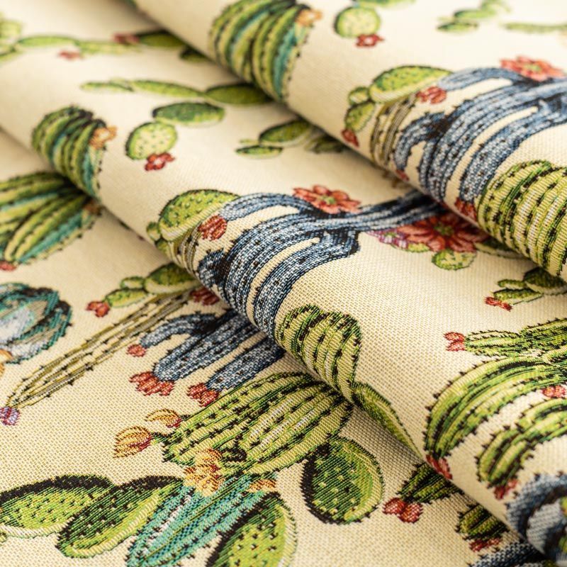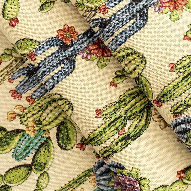 Гобелен представляет собой ткань, выполненную  перекрестным плетением нитей с одномоментным созданием сюжетной или орнаментальной композиции. Это плотный материал высокую прочность и износостойкость. Гобелен используют для пошива плотных светонепроницаемых штор, декоративного домашнего текстиля и аксессуаров, в мебельном производстве для обивки мебели. Так же применяется в рукоделии: модные кошельки, сумочки, пояса и другие аксессуары и при изготовлении дизайнерской одежды. На спокойном песочно-бежевом фоне, как в пустыне, зацвели кактусы.