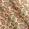 Гобелен представляет собой ткань, выполненную перекрестным плетением нитей с одномоментным созданием сюжетной или орнаментальной композиции. Это плотный материал высокую прочность и износостойкость. Гобелен используют для пошива плотных светонепроницаемых штор, декоративного домашнего текстиля и аксессуаров, в мебельном производстве для обивки мебели. Так же применяется в рукоделии: модные кошельки, сумочки, пояса и другие аксессуары и при изготовлении дизайнерской одежды. На спокойном песочно-бежевом фоне растительный цветной узор в стиле пейсли.