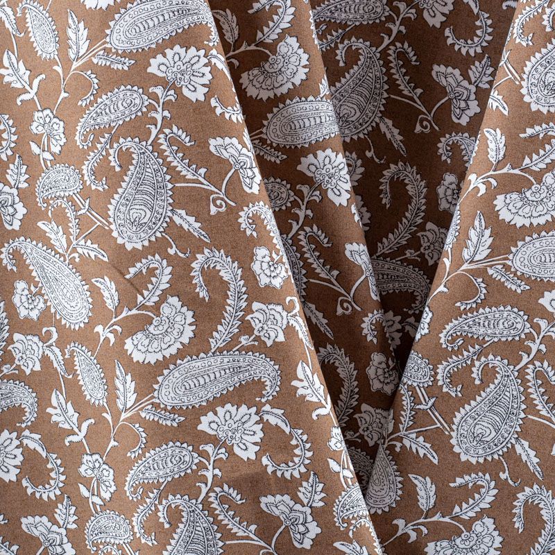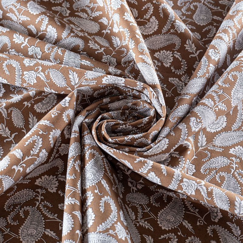 Итальянский плательно-рубашечный натуральный хлопок с узором пейсли в черно-белой гамме на фоне цвета ореховой скорлупы. Ткань имеет плотное переплетение, матовую гладкую поверхность, хорошо держит форму, не прозрачная. Подойдет для пошива рубашек, платья-рубашки, юбки, сарафана, туники, домашней одежды.