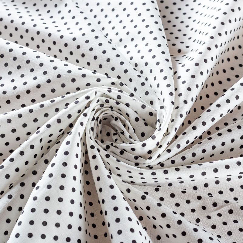 Плательно-блузочная ткань из натурального хлопка в мелкий черный горошек. Ткань легкая, тонкая, хорошо "дышит", мягкая, не прозрачная. Подойдет для пошива летнего платья, летящей юбки, блузы, сарафана, комбинезона или рубашки.