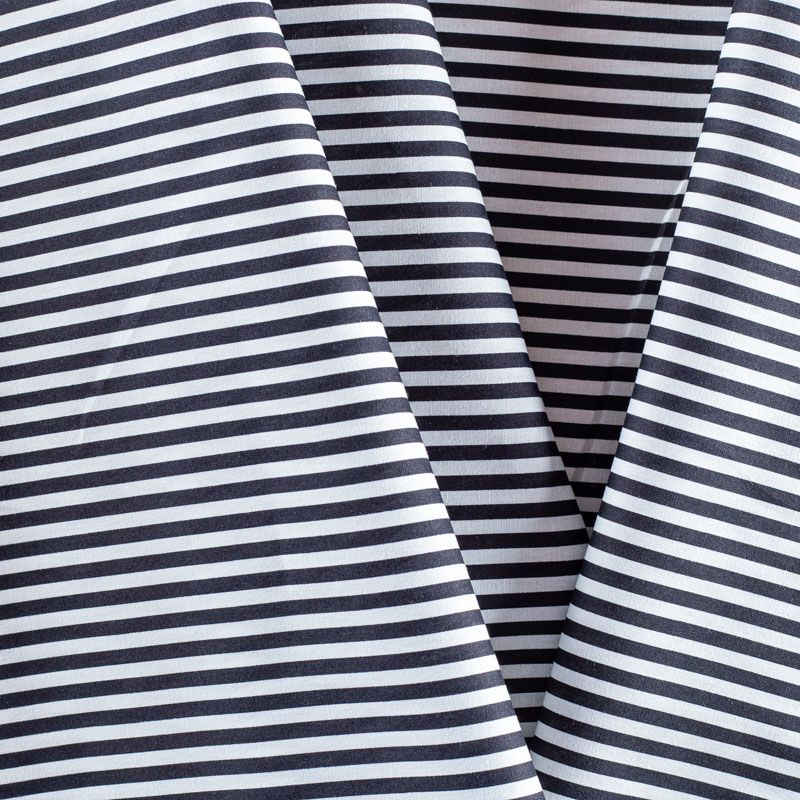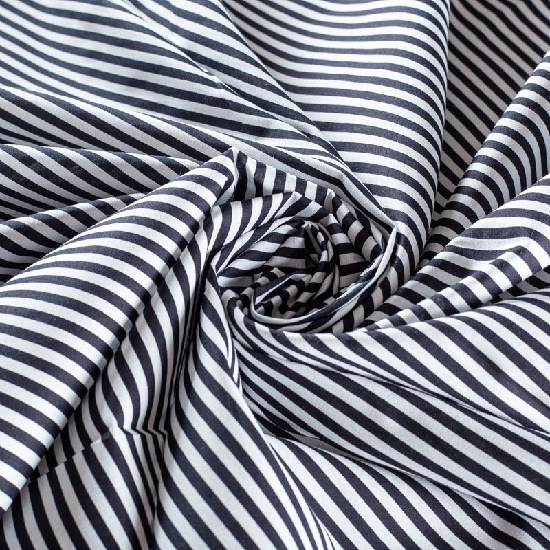 Плательно-блузочная ткань из натурального хлопка в вертикальную черную полоску. Ткань легкая, тонкая, хорошо "дышит", мягкая, не прозрачная. Подойдет для пошива летнего платья, летящей юбки, блузы, сарафана, комбинезона или рубашки.