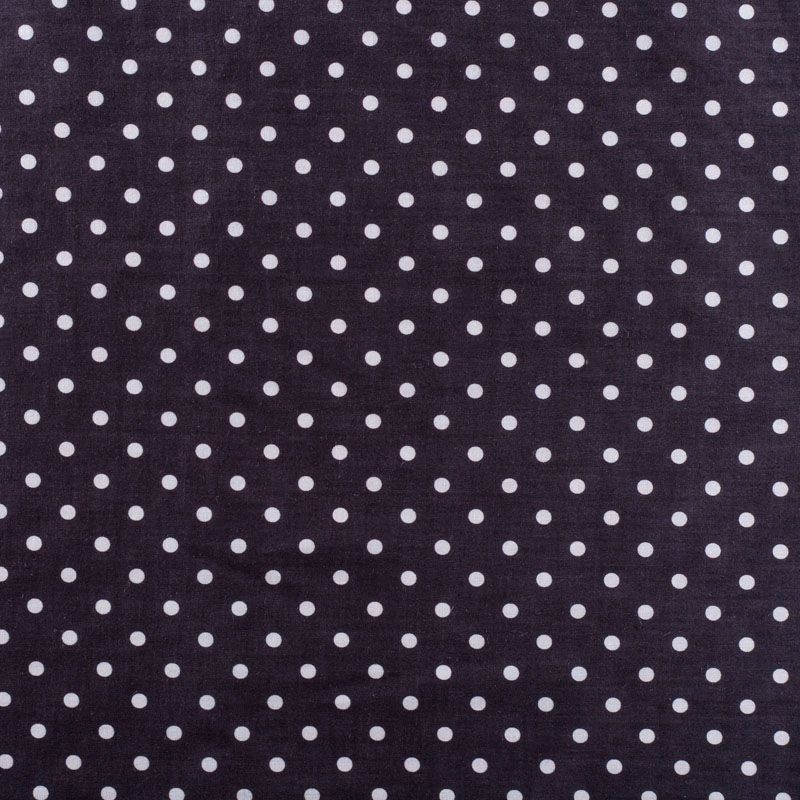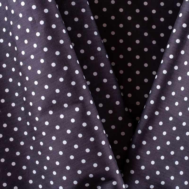 Итальянский плательно-рубашечный хлопок черного цвета в белый горошек. Ткань мягкая, лёгкая, непрозрачная, пластичная и приятная к телу, хорошо драпируется, имеет гладкую матовую поверхность и сатиновое плетение. Прекрасно подойдет как для пошива платья-рубашки, сарафана, платьев различных фасонов, туники, топа, летнего костюма, комбинезона, мужской и детской одежды.