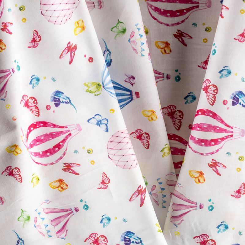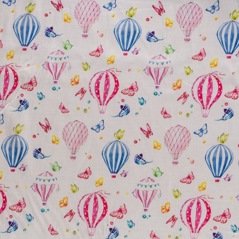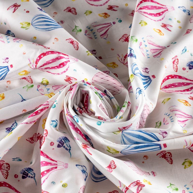 Итальянский натуральный хлопок с детским принтом в виде ярких воздушных шаров с бабочками. Ткань легкая, тонкая, хорошо "дышит", мягкая, слегка прозрачная, по плотности напоминает батист. Подойдет для пошива домашней одежды, детских летних платьев, песочников, юбки, сарафана или рубашки, а также для для пошива постельных принадлежностей, подушек, покрывал, скрапбукинга, корзин и других видов творчества.