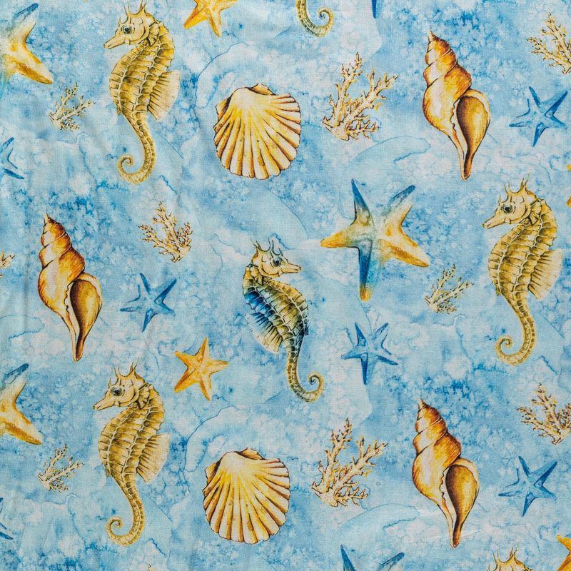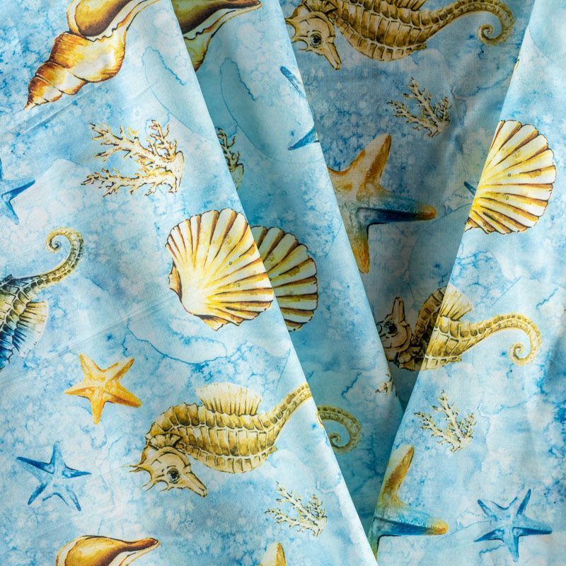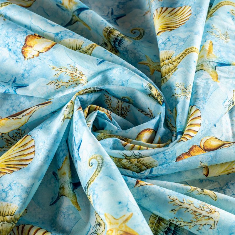 Итальянский натуральный хлопок с красивым морским принтом в голубых тонах. Ткань легкая, тонкая, хорошо "дышит", мягкая, слегка прозрачная, по плотности напоминает батист. Подойдет для пошива домашней одежды, детских летних платьев, песочников, юбки, сарафана или рубашки, а также для для пошива постельных принадлежностей, подушек, покрывал, скрапбукинга, корзин и других видов творчества.