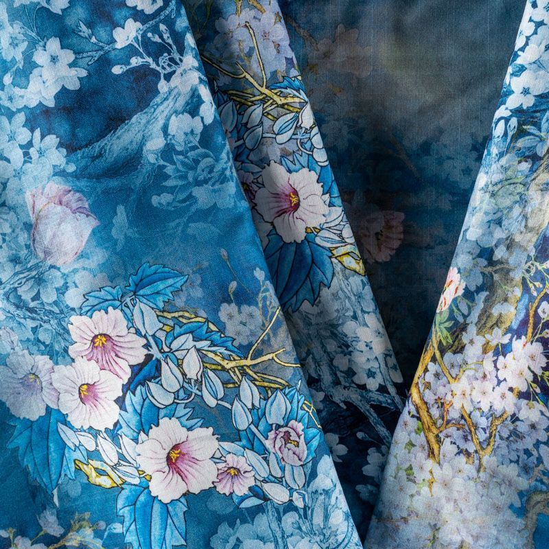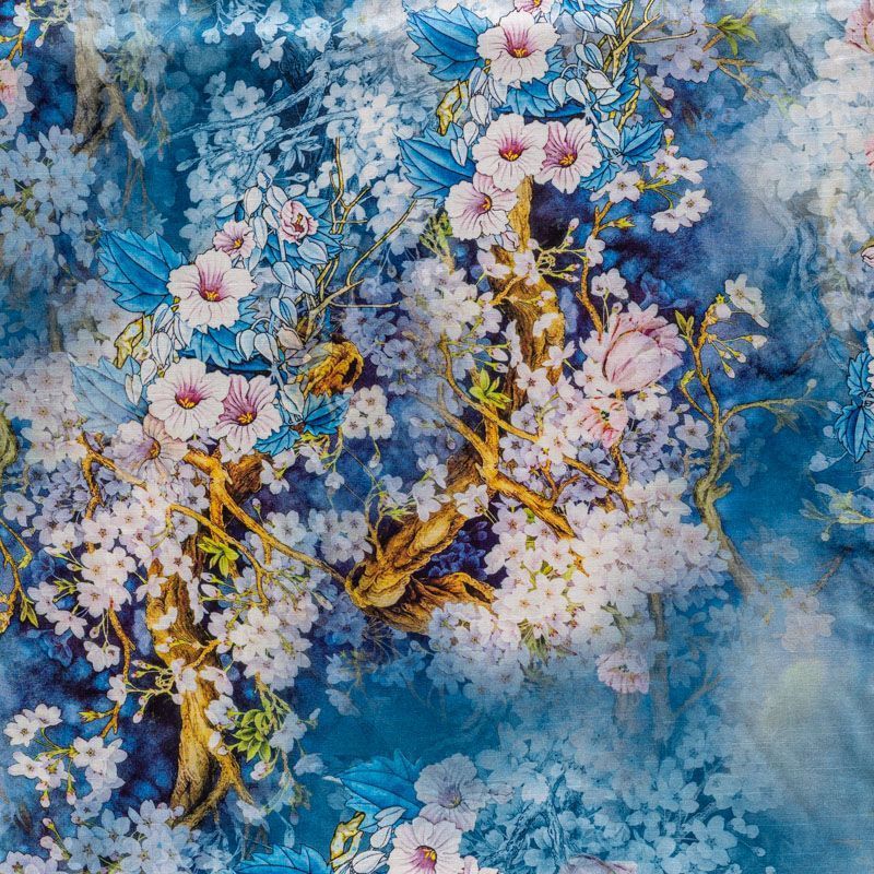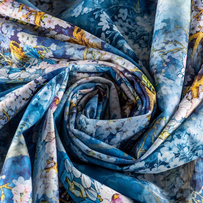 Плательно-блузочная ткань из натурального хлопка с крупным цветочным рисунком в сине-голубых оттенках. Ткань легкая, тонкая, хорошо "дышит", мягкая, слегка прозрачная, по плотности напоминает батист. Подойдет для пошива летнего платья, летящей юбки, блузы, сарафана или рубашки.