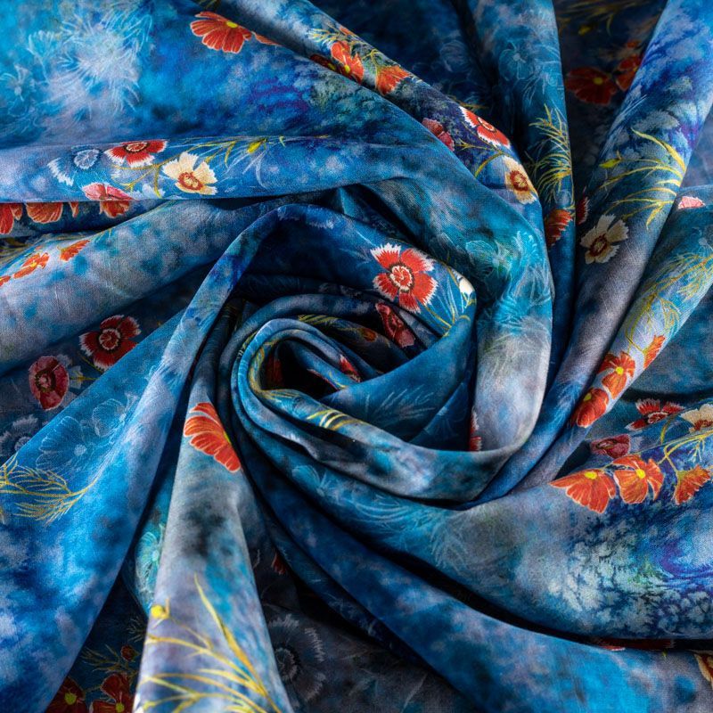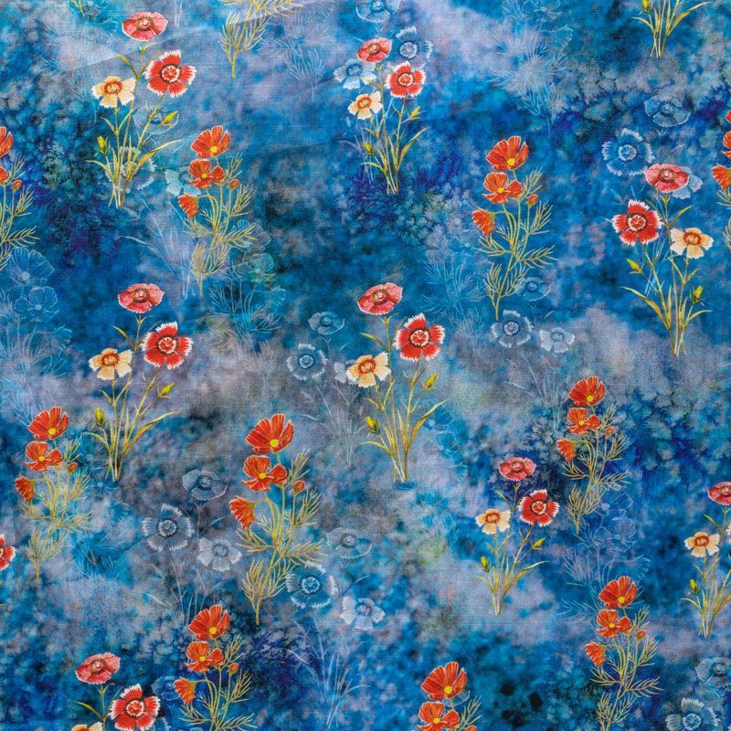Плательно-блузочная ткань из натурального хлопка с ярким цветочным рисунком на разбеленном синем фоне. Ткань легкая, тонкая, хорошо "дышит", мягкая, слегка прозрачная, по плотности напоминает батист. Подойдет для пошива летнего платья, летящей юбки, блузы, сарафана или рубашки.