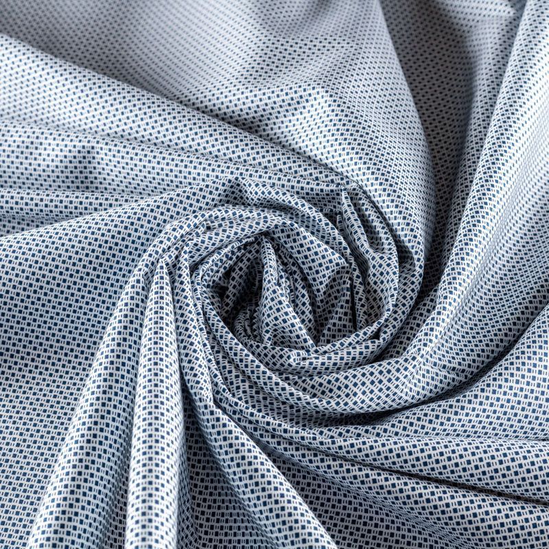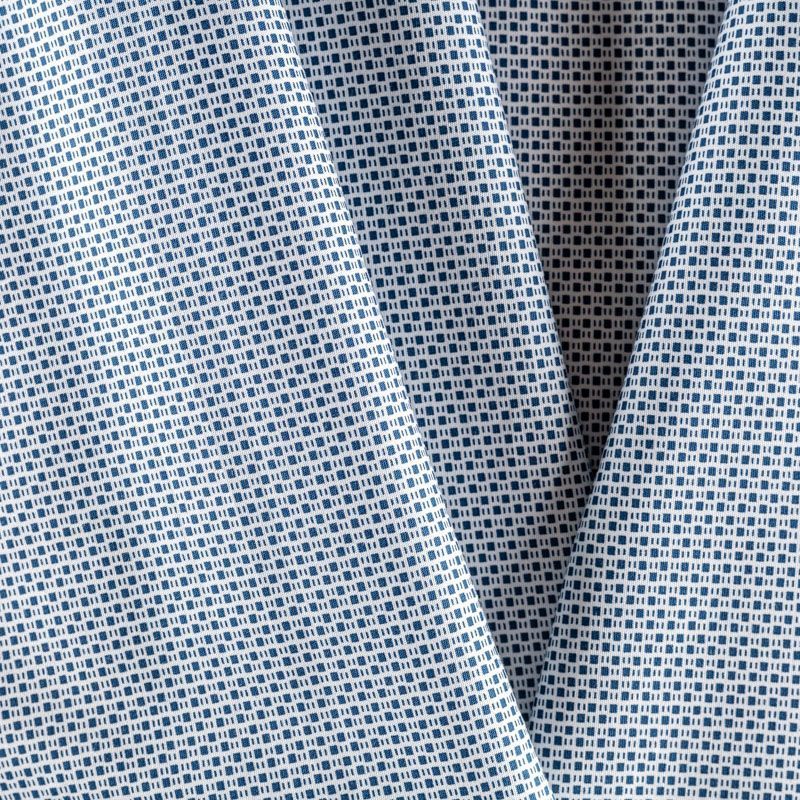 На белом фоне мелкий геометрический узор синего цвета визуально создает эффект мелкой клетки.