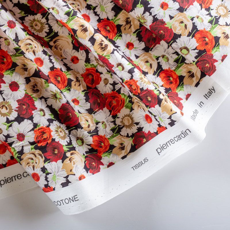 Плательно-рубашечный натуральный хлопок от французского дизайнера с цветочным узором в красно-белых тонах на черном фоне. Ткань имеет плотное переплетение, матовую гладкую поверхность, хорошо держит форму, не прозрачная. Подойдет для пошива рубашек, платья-рубашки, юбки, сарафана, туники, домашней одежды.