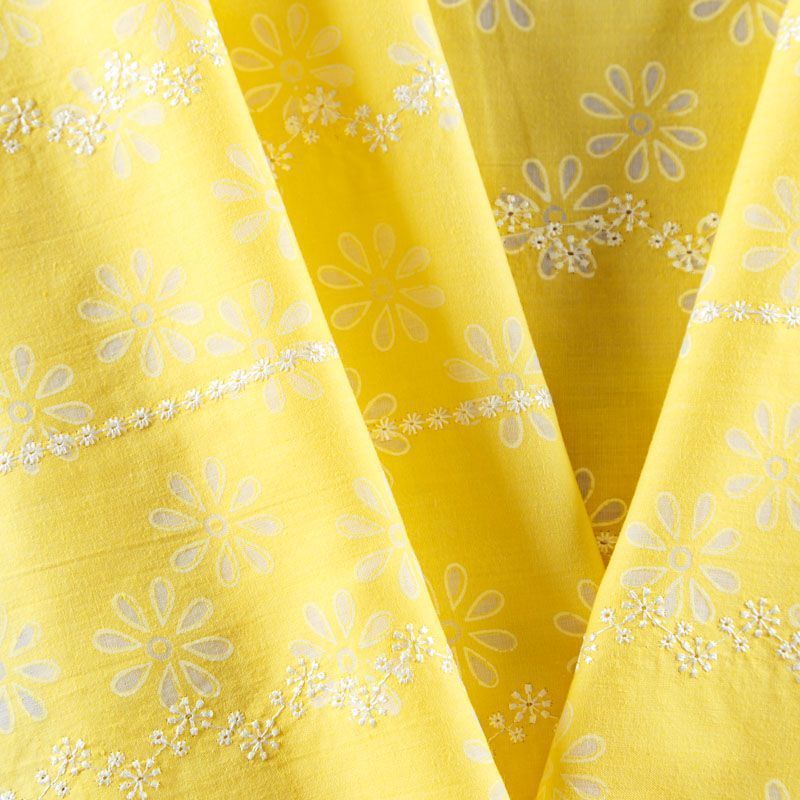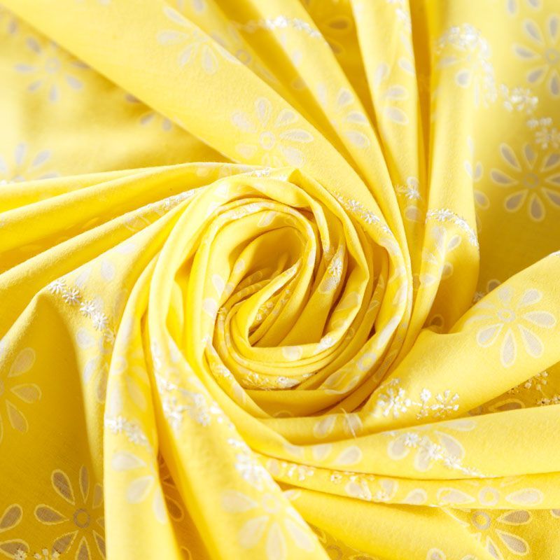Итальянский плательно-блузочный хлопок лимонно-желтого оттенка с эффектом деворе декорирован изящной цветочной вышивкой. Полотно легкое, мягкое, слегка просвечивает, очень нежное и пластичное. Материал отлично драпируется, формируя мягкие складки. Подойдет для любых моделей платьев, сарафанов, а также юбки, туники, топа с воланами, платье-рубашки.