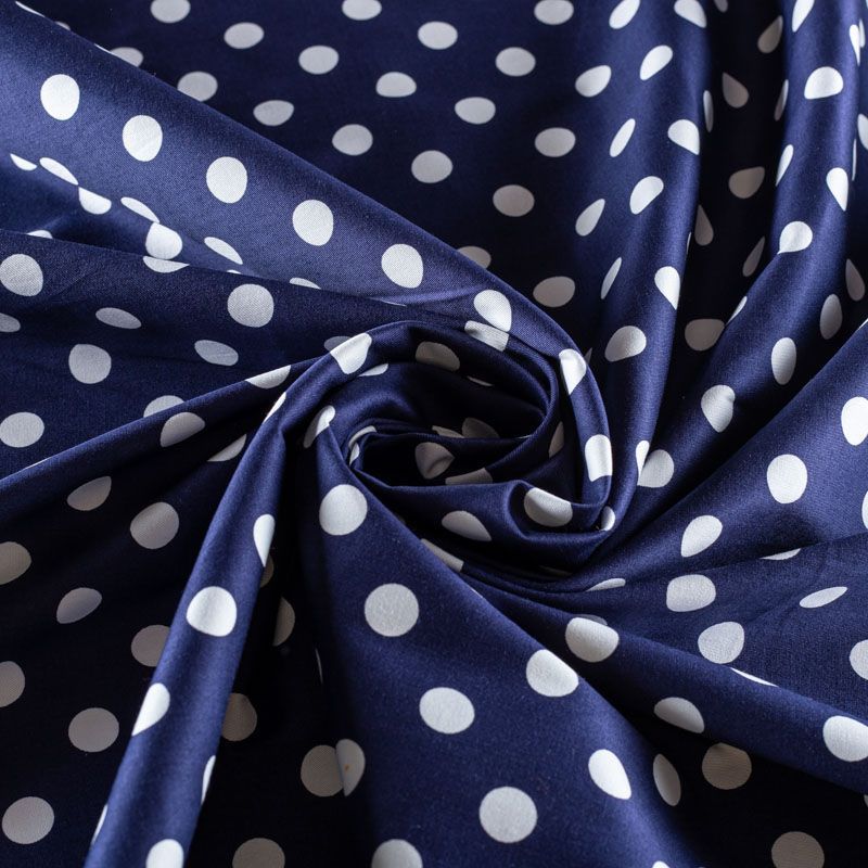 Итальянский костюмно-плательный хлопок темно-синего оттенка цвета в белый горох. Ткань приятная на ощупь тянется за счет эластана в составе, непрозрачная, средней плотности, поверхность гладкая, матовая. Подойдет для пошива костюма, жакета, юбки, платья и других изделий на весенне-летний сезон.