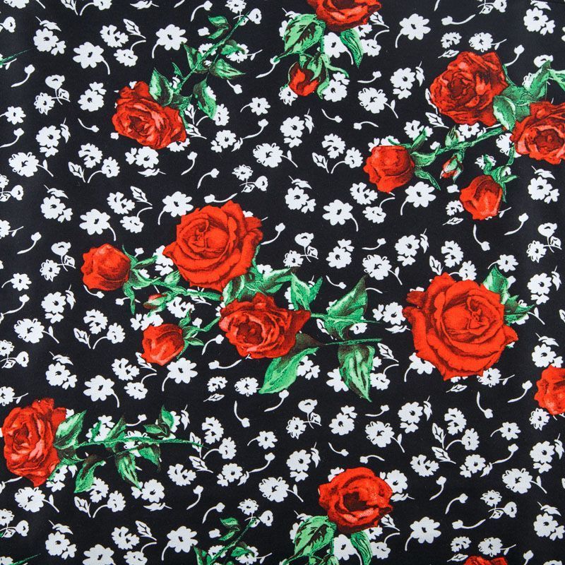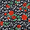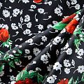 Коттон черного цвета с ярким цветочным принтом. Поверхность гладкая, матовая, ткань средней плотности, не толстая, хорошо держит форму, тянется за счет эластана в составе. Подойдет для пошива костюма, жакета, юбки, платья, брюк или шорт.
