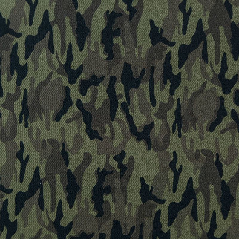 Итальянская хлопковая ткань средней плотности в цвете хаки с камуфляжным принтом. Материал очень приятный на ощупь, эластичный, держит форму. Подойдет для пошива куртки, парки, тренча, легкого жакета, юбки, джоггеров, шорт, платья-сафари и других изделий.