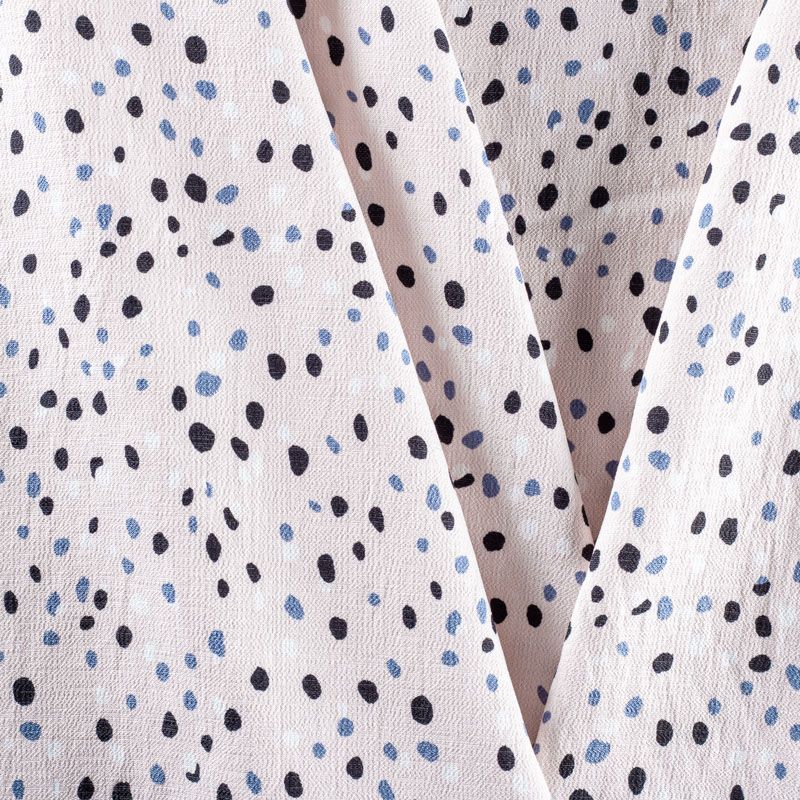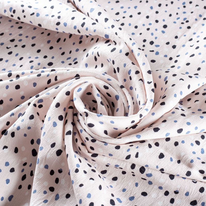 Плательный креп с принтом в горох. Ткань средней плотности, не толстая, пластичная, поверхность полотна матовая, с характерной мелкозернистой фактурой, прочная, хорошо драпирующаяся. Превосходно подойдет для пошива стильного костюма, юбки, платья, комбинезона, топа, брюк.