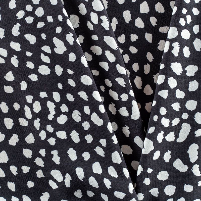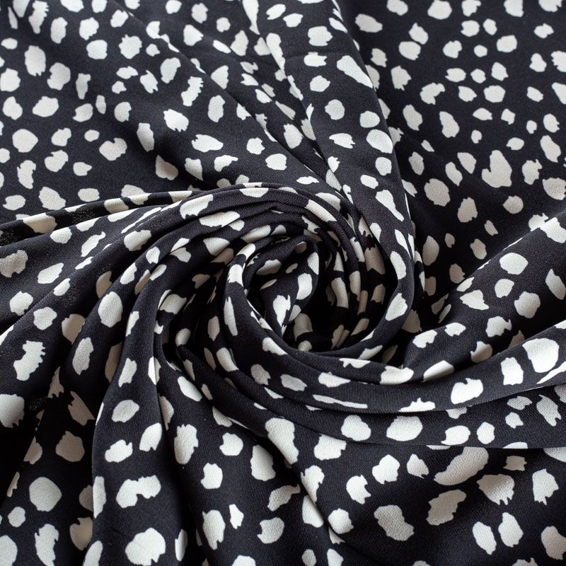 Плательный креп с абстрактным принтом. Ткань средней плотности, не толстая, пластичная, поверхность полотна матовая, с характерной мелкозернистой фактурой, прочная, практически не мнется, хорошо драпируется. Превосходно подойдет для пошива стильного костюма, юбки, платья, комбинезона, топа, брюк.