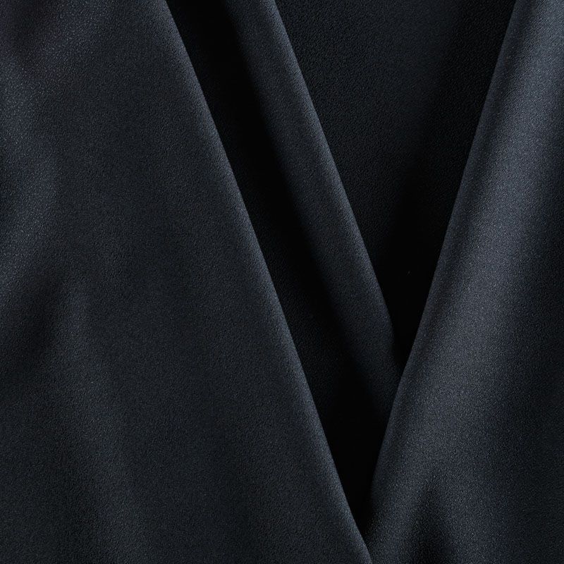 Вискозный креп костюмно-плательной плотности в черном оттенке, поверхность матовая, слегка зернистая. Ткань мягкая, пластичная, образует мягкие фалды, не просвечивает, тянется за счет эластана в составе. Подойдет для пошива весенне-осеннего костюма, платья, комбинезона, юбки, брюк