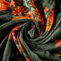 Плательно-блузочная вискозная ткань в холодном темно-зеленом оттенке с крупным цветочным принтом с креповым плетением. Ткань средней плотности, имеет зернистую фактуру и матовую поверхность, не просвечивает, пластичная, хорошо драпируется мягкими складками, струится. Подходит для пошива платья и сарафана, юбки, блузки, туники, топа, комбинезона.