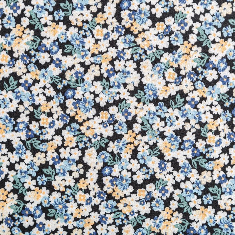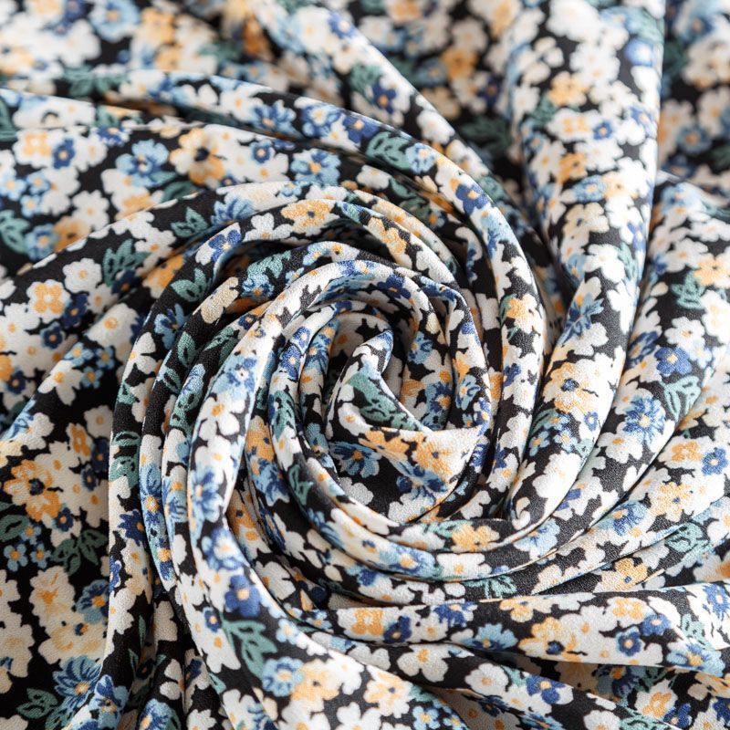 Плательный креп с трендовым уже не первый сезон мелкоцветным принтом на черном фоне, приятный и комфортный в носке, не мнется и не прозрачен на свету, имеет мелкозернистую матовую поверхность, тянется за счет эластана в составе. Идеально подойдет для пошива платья, юбки, широких брюк, комбинезона, блузки, топа или туники.