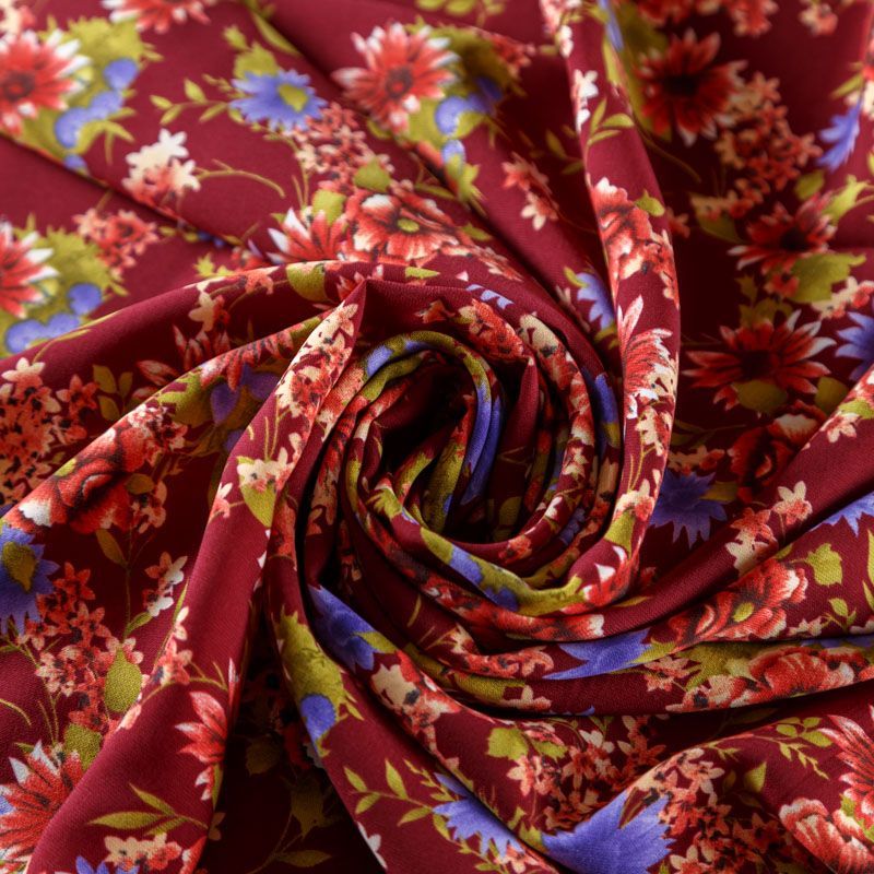 Плательный креп с цветочным принтом. Ткань средней плотности, не толстая, пластичная, поверхность полотна матовая, с характерной мелкозернистой фактурой, прочная, практически не мнется, хорошо драпируется. Превосходно подойдет для пошива стильного костюма, юбки, платья, комбинезона, топа, брюк.