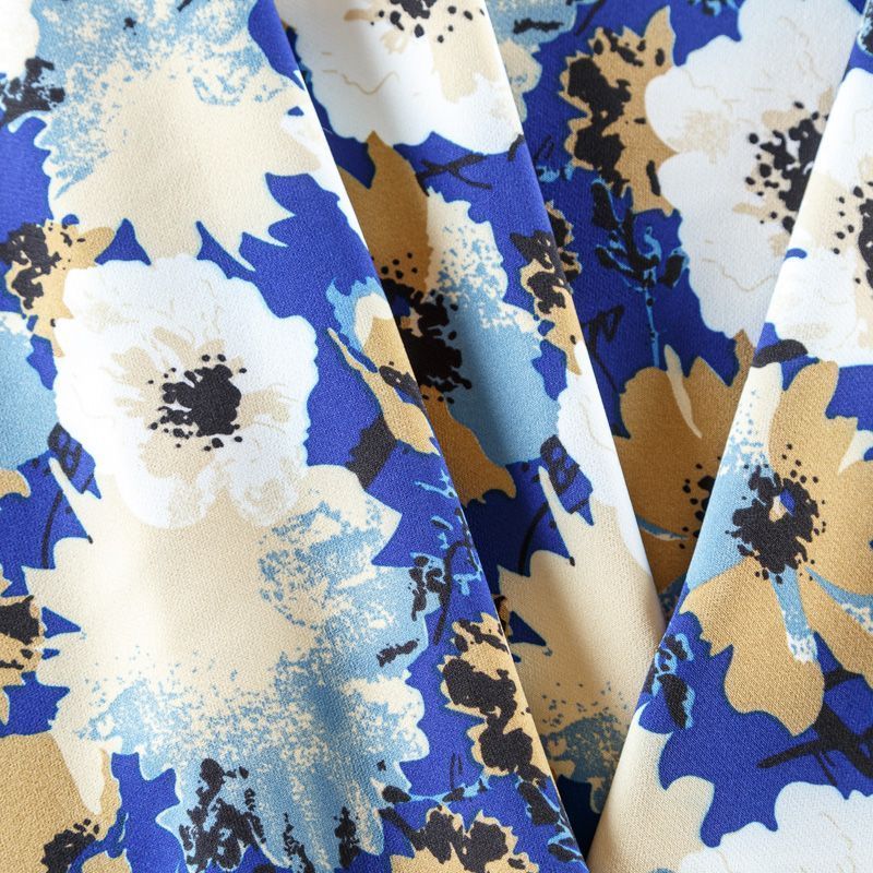 Плательный креп средней плотности, ткань не толстая, пластичная, поверхность полотна матовая, с характерной мелкозернистой фактурой, прочная, практически не мнется, хорошо драпируется, тянется за счет эластана в составе. Превосходно подойдет для пошива свободного костюма, юбки, платья, кардигана, лонгслива, комбинезона, топа, брюк.