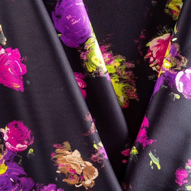 Итальянский вискозный креп-атлас плательной плотности глубокого черного цвета с ярким акцентным принтом. Поверхность имеет заметный блеск, на ощупь гладкая, приятная и упругая. Ткань малосминаемая, тянется за счет эластана в составе, красиво драпируется, струится и дает объемную складку, не просвечивает. Идеально подойдет для шикарного платья, блузы, юбки, комбинезона, брюк свободного кроя.