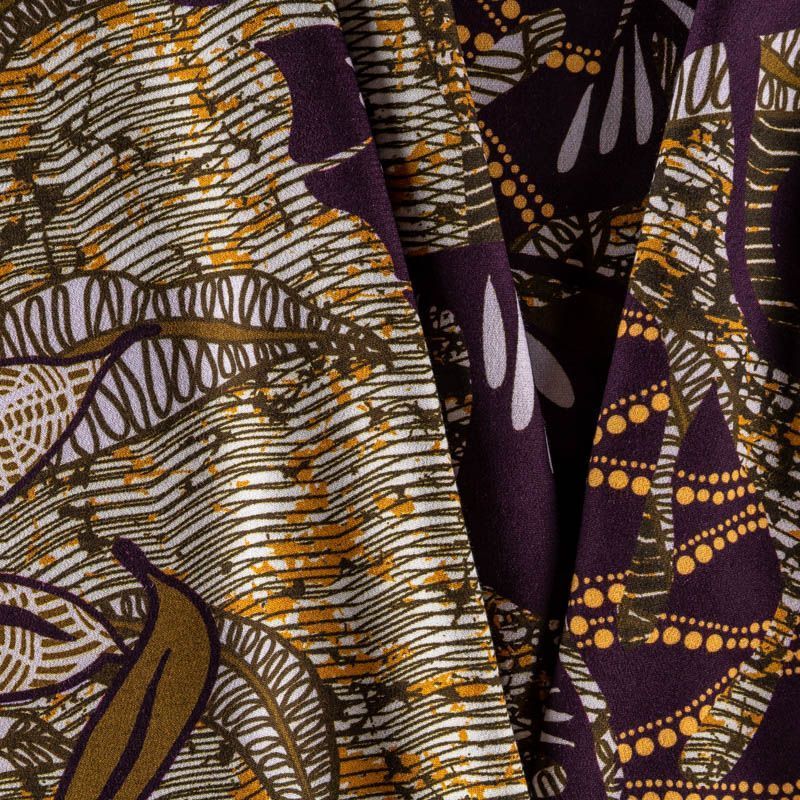 Натуральная вискозная ткань с абстрактным принтом в желто-болотных оттенках. Легкая, хорошо тянется, драпируется струящимися складками, приятная и комфортная в носке. Идеально подходит для пошива  платьев, юбок, блуз, комбинезонов. Материал слегка мнется и прозрачен на свету, имеет креповую фактуру.