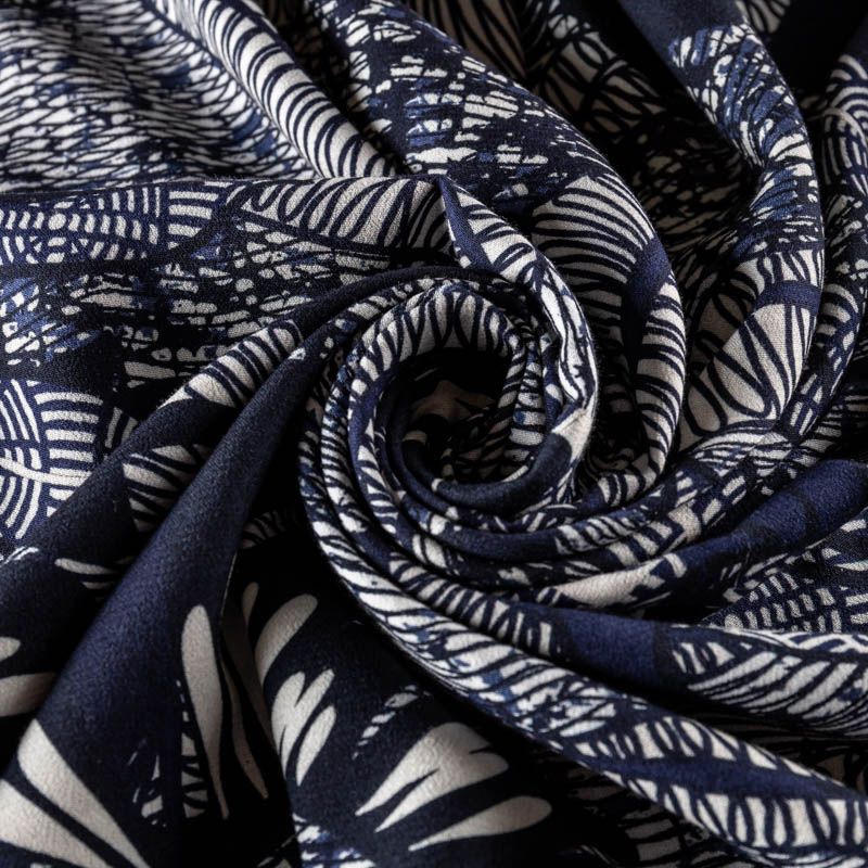 Натуральная вискозная ткань с абстрактным принтом в синих оттенках. Легкая, хорошо тянется, драпируется струящимися складками, приятная и комфортная в носке. Идеально подходит для пошива платьев, юбок, блуз, комбинезонов. Материал слегка мнется и прозрачен на свету, имеет креповую фактуру.