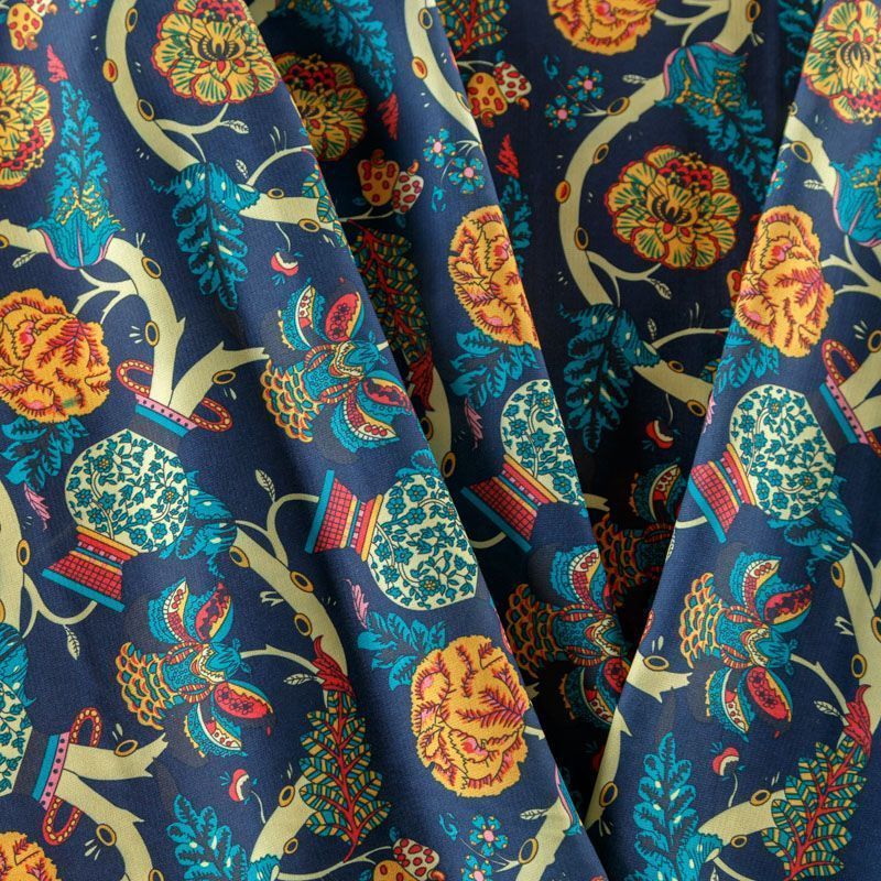 Креп-шифон легкий, воздушный, мягкий и нежный, прекрасно драпируется, тянется, приятен к телу, полупрозрачный, может потребоваться подклад. Поверхность шероховатая, матовая, без блеска. Тянется за счет эластана в составе. Идеален для нежных платьев летящих силуэтов, топов, туник, блузок, юбок с роскошными драпировками и воланами.